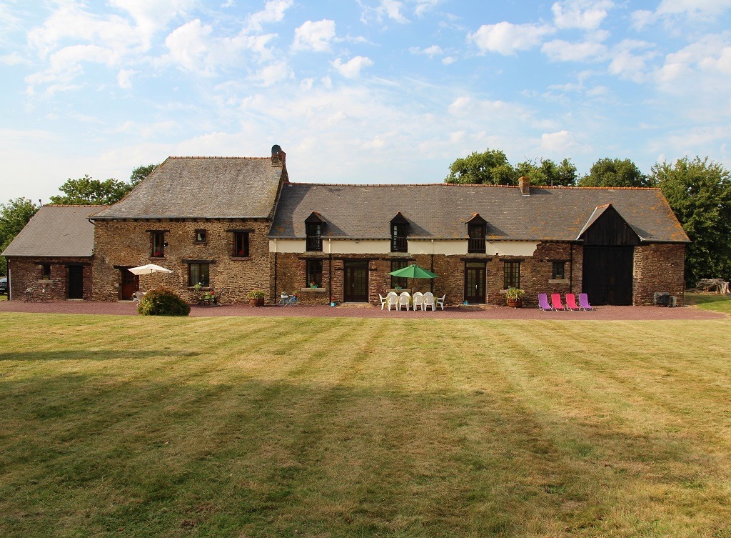 The front door leads to a beamed living room with an area of 55sq m. There is a traditional Breton fireplace made of local stone into which is set a wood burning stove. The floor is tiled and there are exposed stone walls throughout.